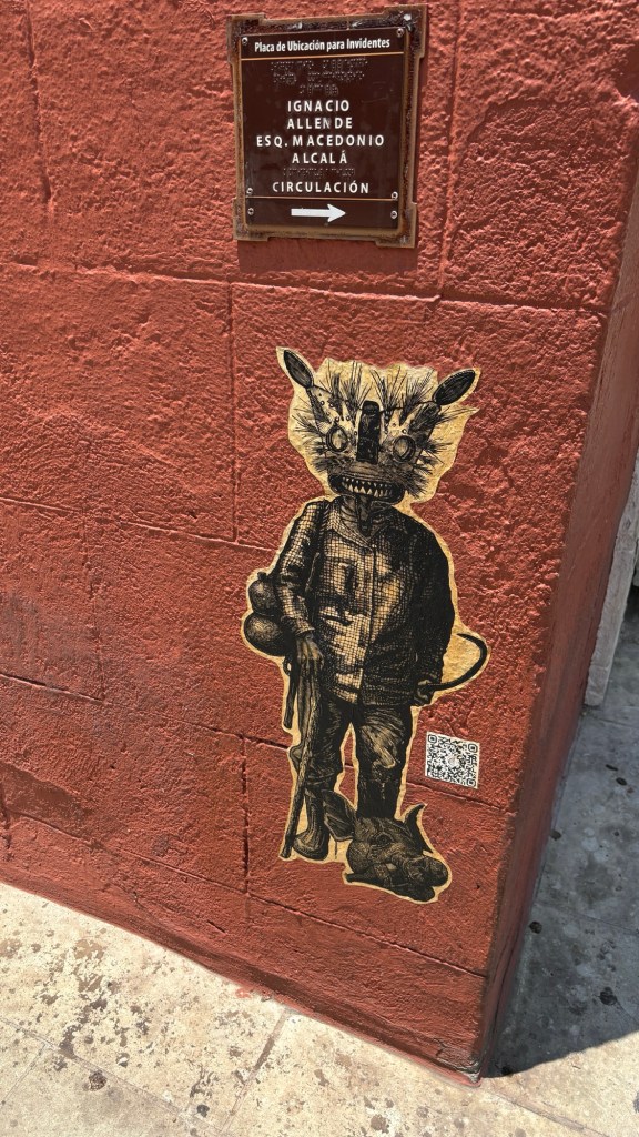 En la intersección entre Ignacio Allende y Macedonio Alcalá encontré una de esas presencias. No fue parte de una exposición ni tenía cédula oficial, pero era, sin duda, una pieza. Pegada con precisión sobre un muro rojo, una figura humanoide con machete, sombrero en mano y botas, pero con la cabeza sustituida por una máscara fantástica. Orejas de animal, ojos vacíos, dientes afilados. Un personaje imposible, pero familiar.