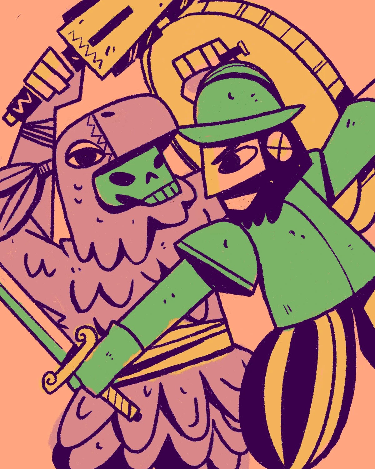 Eso se nota en los resultados. Las ilustraciones de este compilado son muy distintas entre sí en tema y tono: un Joker trabajado en dos registros completamente diferentes — uno con línea expresiva y color plano en teal y salmón, otro en caricatura exagerada y cómica — demuestra que la misma herramienta puede sostener tanto el trabajo más elaborado como el sketch rápido y honesto. Una batalla entre Link y un caballero oscuro con paleta limitada en azul y amarillo tiene la energía dinámica de un cómic editorial. Un retrato femenino rodeado de rosas en blanco y negro es casi lo opuesto: quieto, atmosférico, delicado.